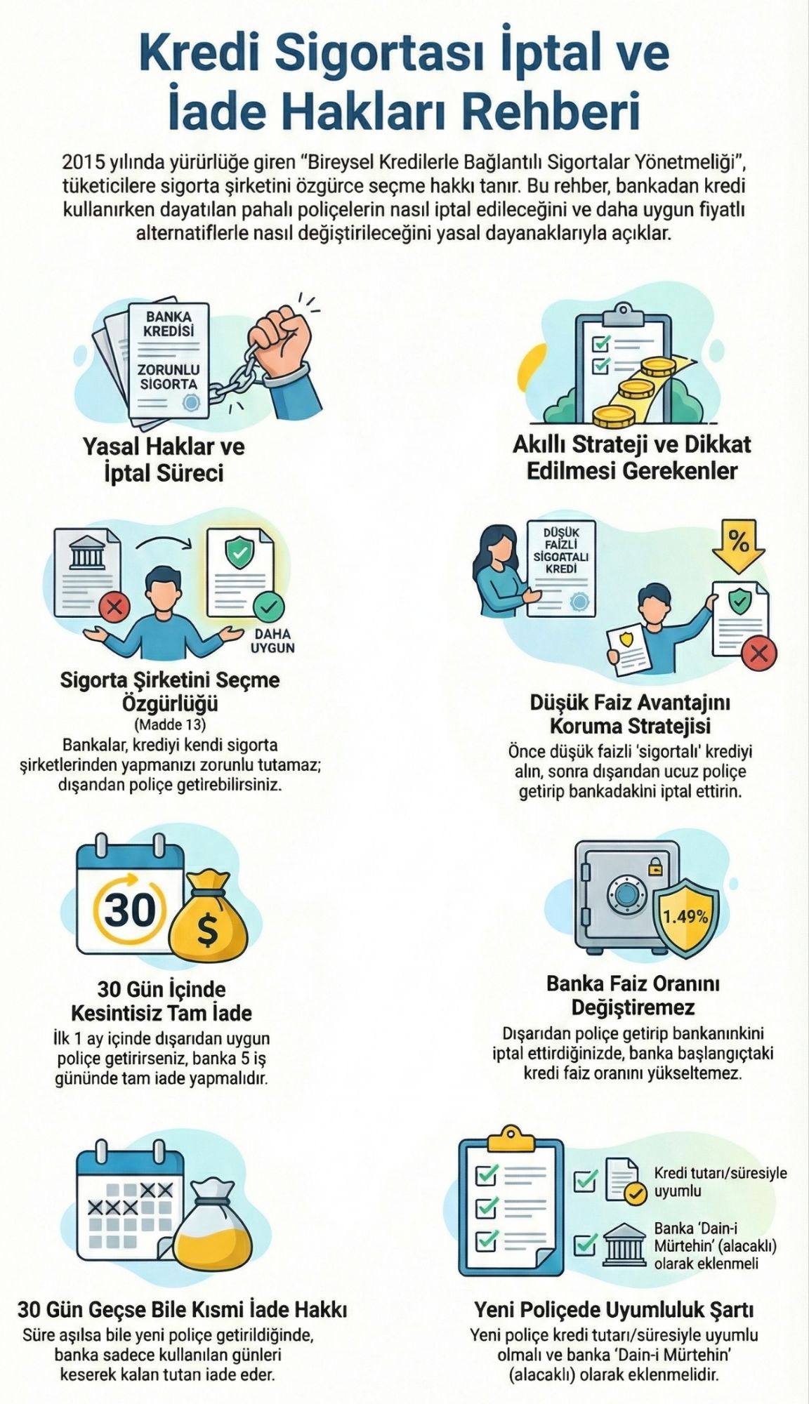 Kredi başlangıç tarihinden itibaren 1 ay (30 gün) içerisinde, dışarıdan daha uygun fiyata (örneğin yarı fiyatına) bir poliçe yaptırıp bankaya sunarsanız; banka mevcut poliçeyi iptal etmek ve kestiği primin tamamını 5 iş günü içerisinde kesintisiz olarak size iade etmek zorundadır.